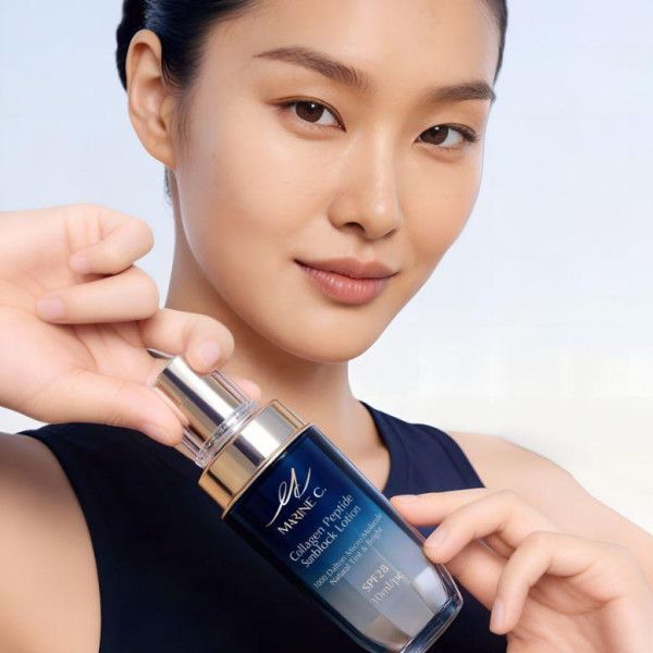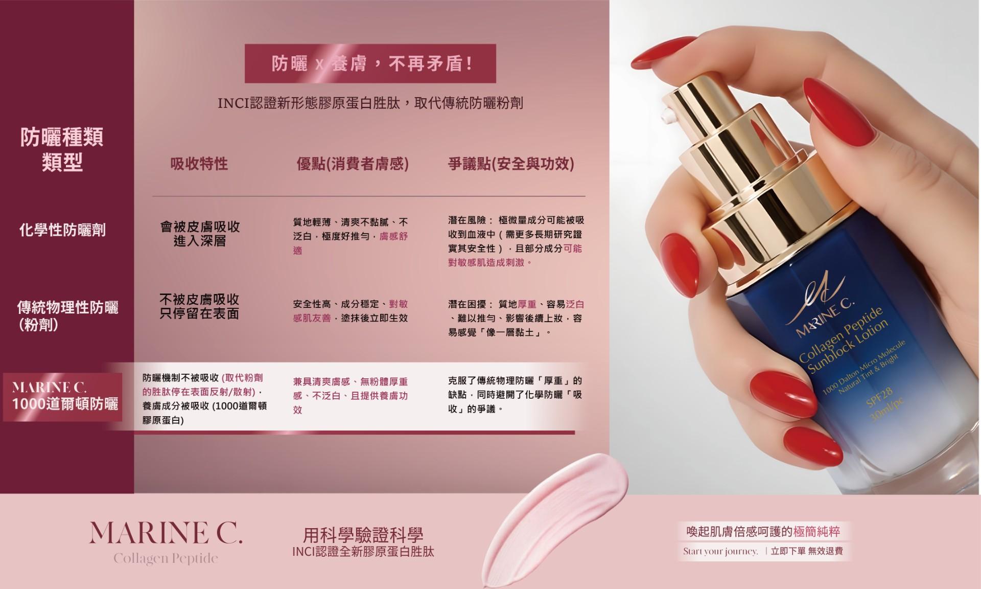 傳統物理防曬為了追求輕透而「奈米化」,但最大風險就是皮膚穿透風險。 MARINE C. 實驗室發現: 唯有維持物理粉體的黃金比例,並注入 1000道爾頓可食胜肽,才能在不傷害肌膚的前提下,發揮最強大的折射效應與水感體驗。 當物理粉體在表層反射紫外線時,1000Da 胜肽同步進行深層修護。這是第一款「邊防曬、邊餵養」的食物級防曬,讓敏感肌在防禦的同時,增強修護力